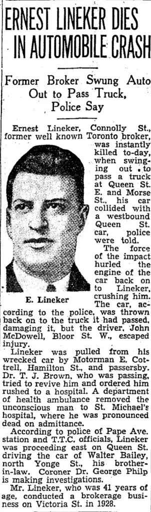 The 1934 directory lists Ernest E. Lineker as a financial agent with an office in a room at 6 Adelaide Street East and his home as 107 Connolly Street. The 1935 directory just lists his office and the 1936 directory has no listing for anyone named Lineker. I have no idea whether he died unmarried or whether his widow left town after the accident. An Internet search turned up no ancestry records or other information about him.