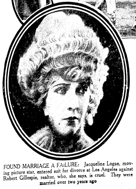 Jacqueline Logan (1904-1983) was a silent film star whose career did not survive the transition into talkies. Wikipedia lists her first husband's name as Ralph James "Bob" Gillespie; the page states that she claimed that he kicked her and called her dumb.