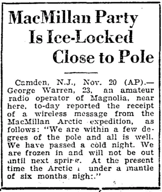 Donald Baxter MacMillan (1874-1970) started his adult life as a high school teacher. In 1908, he saved the lives of nine shipwrecked people over two days; this led to Robert E. Peary inviting MacMillan to join him on his expedition to the North Pole. MacMillan then travelled extensively in Labrador, studying the Inuit who lived there, and then organized an ill-fated attempt in 1913 to reach Crocker Land, an island supposedly discovered by Peary that turned out not to exist. This expedition was stuck in the Arctic until 1917.