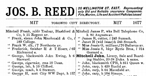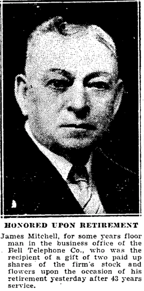 Out of curiosity, I looked Mr. Mitchell up in the Toronto city directories. It turns out that "floor man" is a euphemism: the 1931 city directory lists a Jas P Mitchell as a janitor at Bell Tel, and his address as 112 Macdonell Avenue.