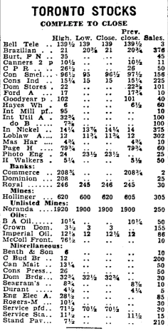 A gift of "two paid up shares of the firm's stock" might not seem very generous, but Bell stock was actually reasonably expensive at that time. Here's the closing prices for the Toronto Stock Exchange on that day: