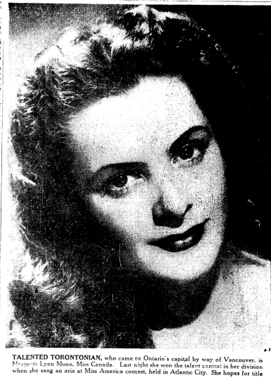 A search turned up very little on Margaret Lynn Munn. I found some stock footage of her being crowned Miss Canada and a couple of other references to her from around that time. But I don't know what happened to her after that.