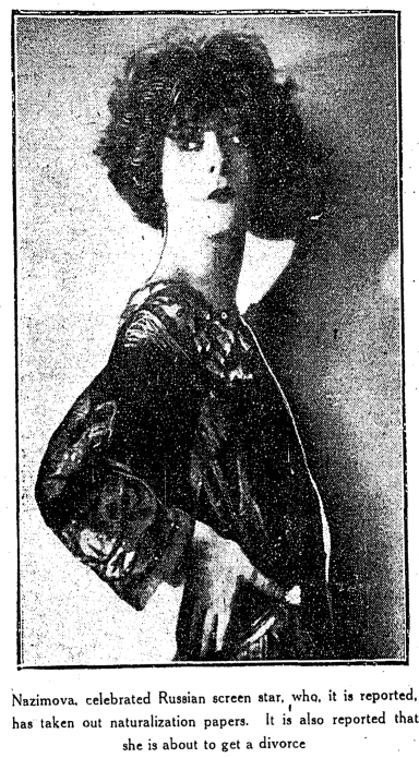 Her divorce turned out to be quite interesting: she wasn't actually married in 1925. She had originally married Sergei Golovin, a Russian actor, in 1899, and the two divorced in 1923. On moving to the U.S., she pursued relationships with women, and pretended to be married to Charles Bryant as a cover. When Bryant married later in 1925, it was discovered that he and Nazimova were never married, which caused a scandal.