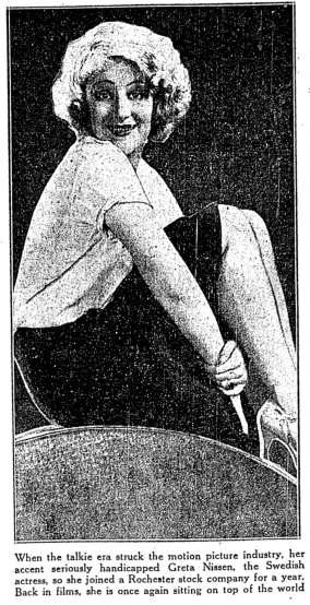 Greta Nissen (1906-1988) started her performing career as a ballerina, appearing on Broadway in 1924, and then appeared in a number of films between 1923 and 1928. She was originally cast as the lead in Howard Hughes' Hell's Angels, but was paid off and removed from the film when it was converted from a silent film to a talkie, as she was playing the part of a British aristocrat and spoke with a noticeable Norwegian accent.