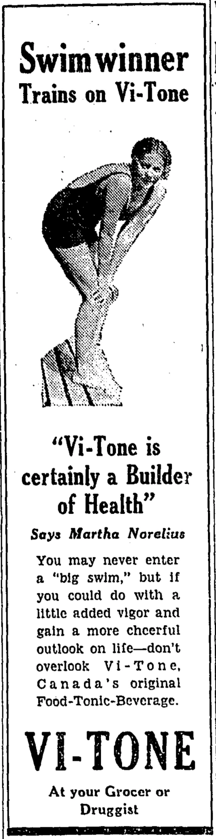 Martha Norelius (1909-1955) won the Wrigley Marathon swim event in Toronto, held at the Canadian National Exhibition in 1929. At about this time, she also met her future husband, rower Joseph Wright, Jr. She died following gall bladder surgery at the young age of 46.
