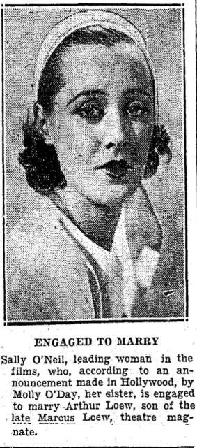 I don't know what happened, but Sally O'Neil (1908-1968) and Arthur Loew did not get married. Ms. O'Neil married Stewart S. Battles in 1953; they divorced but then married again. Loew eventually married Mildred Zukor, daughter of Adolph Zukor, co-founder of Paramount Pictures; he later became president of MGM.