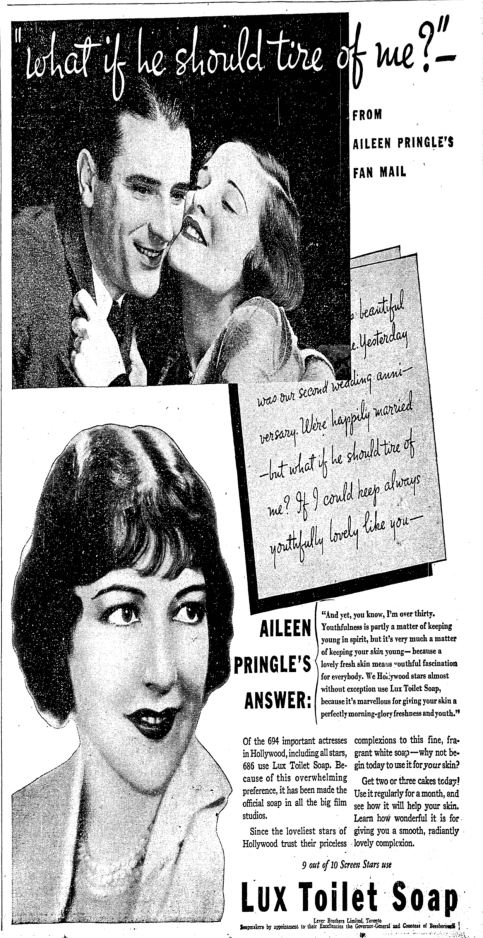 Like other Lux ads of this era, this ad is oddly specific: it claims that 686 of the important 694 actresses in Hollywood use Lux, including all stars. It then claims that "9 out of 10 Screen Stars" use Lux. Oh, well - you can't expect copywriters to have fluency with numbers.