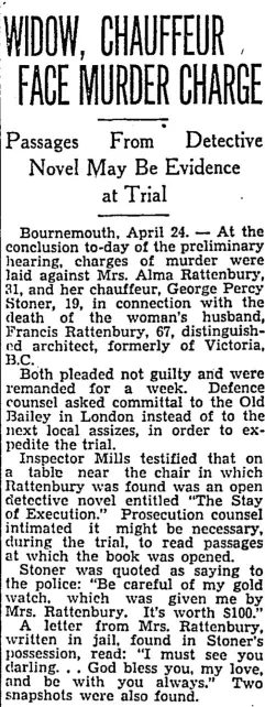 Both Stoner and Mrs. Rattenbury pleaded not guilty to her husband's murder. He was convicted but she was acquitted after only an hour of deliberation. (Trigger warning ahead.) Four days after being set free, on June 4 1935, she committed suicide by stabbing herself repeatedly.