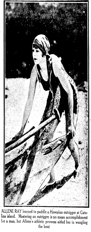 Allene Ray (1901-1979) was midway through her film career at the time this photograph was taken. She was used to doing her own stunts and had already mastered horseback riding, so working with a Hawaiian outrigger was well within her skill set.