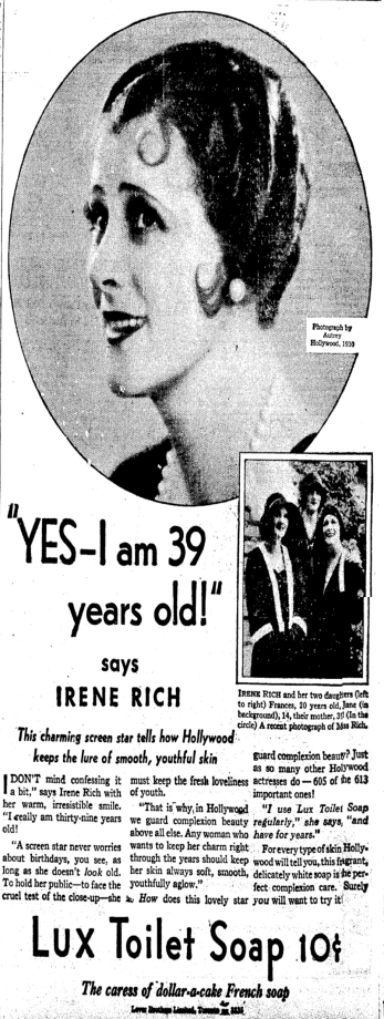 Irene Rich (1891-1988) really was 39 years old at the time that this ad came out. Her Hollywood career had started relatively late: in 1918, when she started seeking work as an extra, she had been married and divorced twice and had two daughters. She appeared in a number of silent films in the 1920s, including eight pictures by Will Rogers. In the 1930s, she made the transition to radio, hosting her own show from 1933 to 1944. She has two stars on the Hollywood Walk of Fame, one for her film work and one for radio.