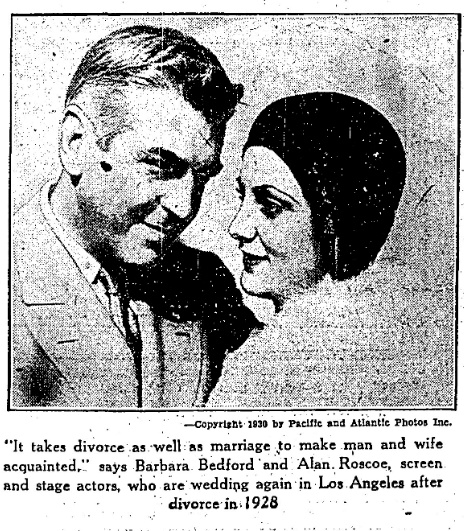 Alan Roscoe (1888-1933) appeared in movies starting in 1915. He and Ms. Bedford did indeed remarry in 1930 but their second marriage was tragically cut short when he died of cancer in 1933. When he died, there was a dispute between Ms. Bedford and Wallace Beery over Roscoe's life insurance policy: she maintained that it was intended for her daughter's education and Beery claimed that the money was owed to him for debts.