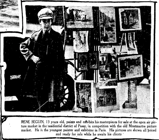 Searches turned up no references to Rene Seguin, either as a child or as an adult. I have no idea what happened to him, but if he was selling paintings at the age of 13 instead of being in school, I fear that life was tough for him.
