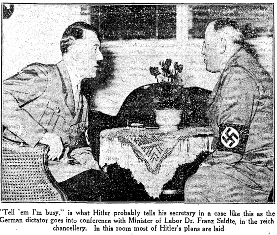 In 1933, when Hitler was appointed Chancellor of Germany, Seldte was given the post of Minister of Labor. He remained in this post through the war and even after Hitler's suicide, though he was marginalized by other Nazis.