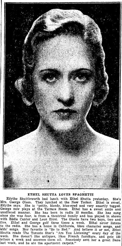 Ethel Shutta (1896-1976) started her career in vaudeville as a child, performing with her family. She became a regular performer on Jack Benny's radio show and toured with her husband, bandleader George Olsen, before divorcing him in 1939.
