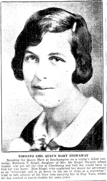 Searches in the Toronto city directories and elsewhere revealed that Ms. Siegel's name was actually Rohama Siegel, and that she was born in 1905. So she was 30 or 31 years old when she decided on impulse to stow away on the Queen Mary.