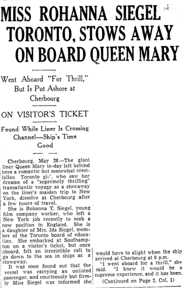 The front page of the May 28 1936 edition of the Toronto Daily Star contained a photograph and an article about a woman who stowed away on the Queen Mary. (I've only included part of the article here.)