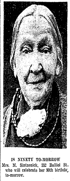 As usual with listings like this, I went to the Toronto city directories to indulge my morbid curiosity: how many more birthdays did she get to have? The answer appears to be about three. The 1929 directory lists Margaret Sintzenich at 552 Balliol and she appears in the 1932 directory at that address. (In the latter, she is listed as the widow of Maurice.) She does not appear in the 1933 directory.
