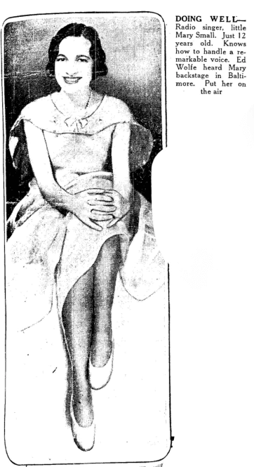 Mary Small (1922-2007), at the time of this photograph, had her own 15-minute weeknight radio show on the NBC radio network, immediately preceding that of Frank Sinatra. Nicknamed "The Little Girl With The Big Voice", she remained successful throughout the 1930s and 1940s and toured with the USO in 1943 and 1944. She left show business to raise her two daughters, returning to Broadway in 1966. She later worked as a vocal coach.