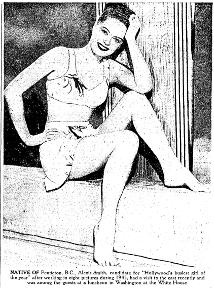Alexis Smith (1921-1993) spent only the first year of her life in British Columbia - her family moved to Los Angeles, and she became an American citizen in 1939 when her parents became naturalized citizens. She had an extensive film, stage, and television career that lasted up until 1990, when she played Lady Jessica Farlow Montford on four episodes of Dallas. She won a Tony award in 1972 for her work in the musical Follies.