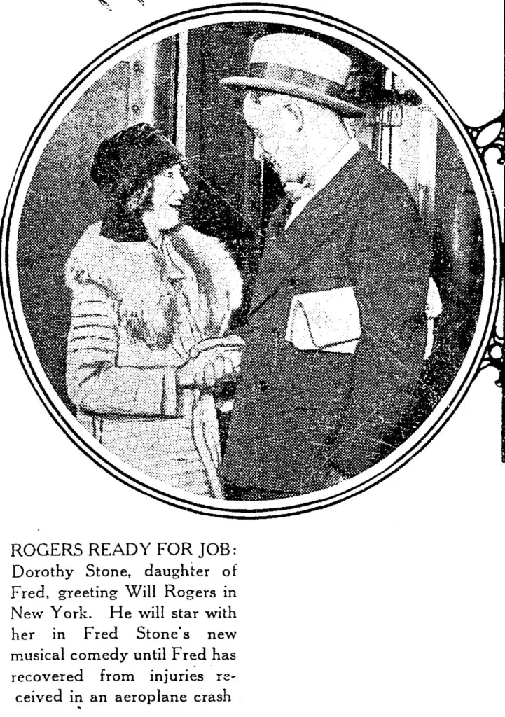 Dorothy Stone (1905-1974) was the daughter of two performers; they had appeared together in a production of The Wizard of Oz and therefore decided to name their child Dorothy. Her mother, actress Allene Crater, discouraged her from entering show business; nonetheless, she became a performer early in life. In 1923, she appeared on Broadway with her father and was critically acclaimed. In 1928, she appeared in Three Cheers, in which Rogers substituted for her father as described in the caption above.