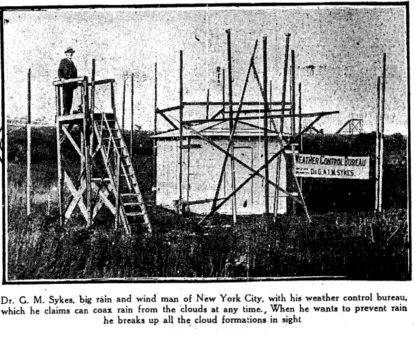 The American Heritage website has an article on Dr. G. M. Sykes - or, to give him his full name, George Ambrosius Immanuel Morrison Sykes. He was actually from Burbank, California, and he was hired in 1930 by New York's Belmont Park Raceway as a professional rainmaker. I suggest reading the article to find out more (spoiler: it didn't work).