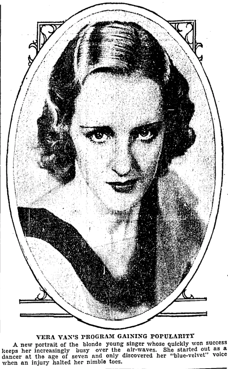 Vera Van (1908-2006) does not have a Wikipedia page, but she does have an Internet Movie Database entry. Her career appears to have peaked in about 1934 to 1936. She lived a very long life, passing away just a few months short of her 98th birthday.