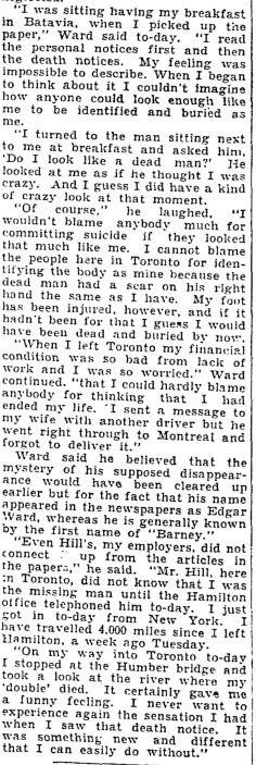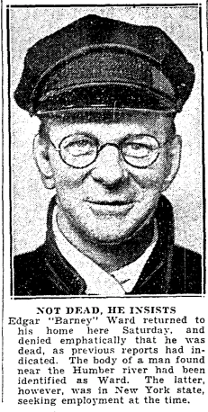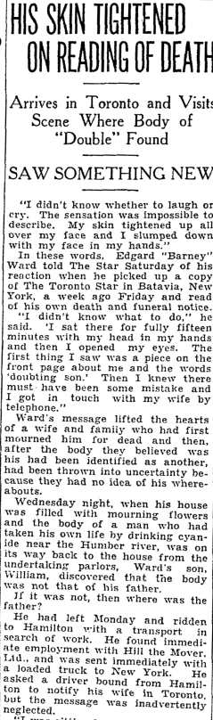 On January 12 1934, Edgar "Barney" Ward was in New York state, working as a mover, away from his wife and family in Toronto. That day, he grabbed a copy of a two-day-old edition of the Toronto Daily Star. Out of habit, he turned to the Deaths section of the newspaper, and was quite startled to discover his own name in it: