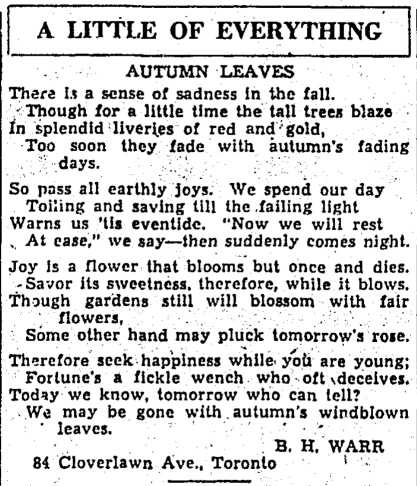 I haven't read many of the poems, but I assume that they vary widely in quality (I'm not a very good judge of poetry). One that I saw in the November 21 1952 edition of the Toronto Daily Star had a melancholy quality, which matched the time of year that it was written:
