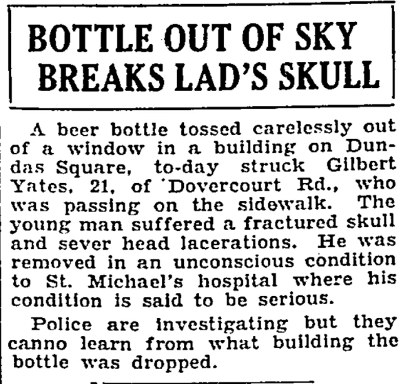 If you think you're having a bad day, consider the plight of Gilbert Yates, reported in this edition of the Toronto Daily Star. He was struck on the head by a randomly thrown bottle while walking down the sidewalk near Dundas Square.