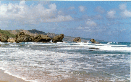 Barbados, topologically, is roughly like an inverted gravy tureen. It's flat by the ocean, and steep hills rise up from the ocean to the centre of the island. The trip to Bathsheba takes about an hour, passing fields of sugar cane and occasional upscale houses. The last few minutes of the trip are hair-raising, as the bus travels down a very steep incline towards the eastern shore.