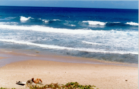 Meet up with a young couple from Winnipeg who are also attempting to boogie board. She is approximately the most attractive young woman I have ever seen anywhere. (See earlier comment about life being unfair, etc.) If all women in Winnipeg are anywhere near this attractive, drawbacks such as -50 windchills must seem like minor annoyances. Oh, well. (Down, boy.) These people are the only representatives of the Gen-X generation in my vicinity: virtually everybody else is in their mid-forties or older, except for a few small children. I feel like a draft dodger hiding out back home while everybody else of my generation marches off to war.