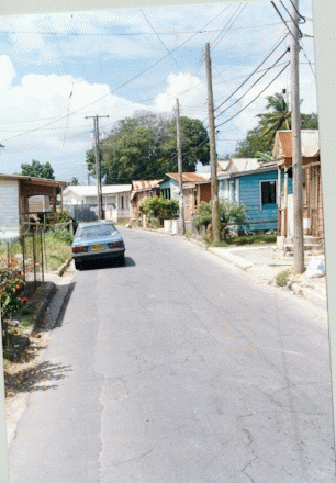 The road leading into the poor part of town. Single-room shacks, a communal toilet, chickens clucking in the road, the whole bit. |