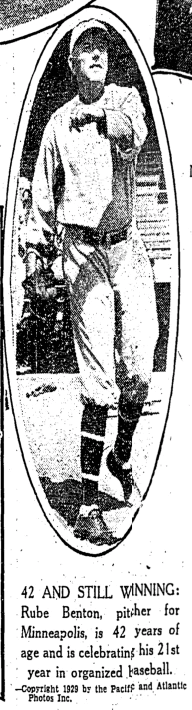 After his major league career ended, Benton started pitching for the Minneapolis Millers in 1926 (a team playing at the Class AA minor league level). He remained with the Millers until 1933, playing until he was (officially) 43 years old.