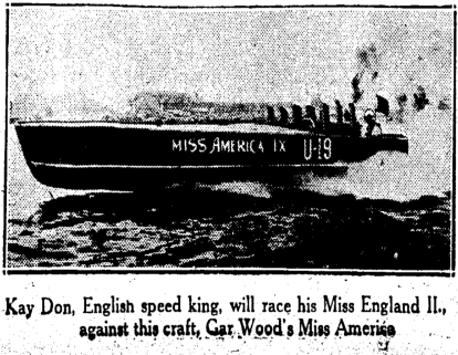 The race described in this caption was the Harmsworth Cup race, which was to be held on the Detroit River; Don's Miss England II was to compete against two American boats piloted by brothers, Garfield and George Wood. The race was apparently witnessed by more than a million spectators; during it, Don and Garfield Wood were disqualified, leaving George Wood as the winner. Garfield Wood won the race every other year that it was held between 1920 and 1933, after which the race was suspended until 1949.