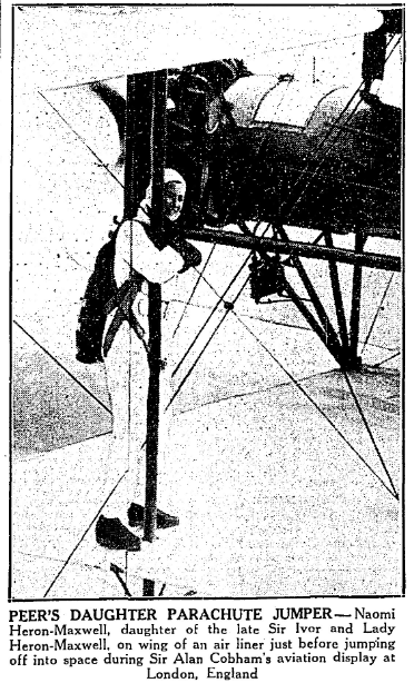Naomi Heron-Maxwell (1913-1983) started taking flying lessons in 1934, when she was 20. In 1935, she joined Alan Cobham's Flying Circus as a parachutist, as pictured above; she performed about a hundred parachute jumps before narrowly escaping death when she opened her parachute just in time after initially not finding its ripcord handle. Her boyfriend at the time asked her to stop parachute jumping, as he considered it too dangerous; sadly, just after that, he died in a car crash.