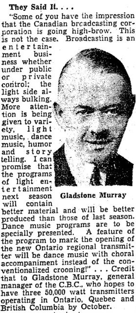 Gladstone Murray (1893-1970) was born William Ewart Gladstone Murray, after the former British Prime Minister. He served as a pilot in World War I and worked for the British Broadcasting Corporation from 1924 to 1935. When the Canadian Broadcasting Corporation was founded in 1936, he became its first general manager, serving in that post until 1942.